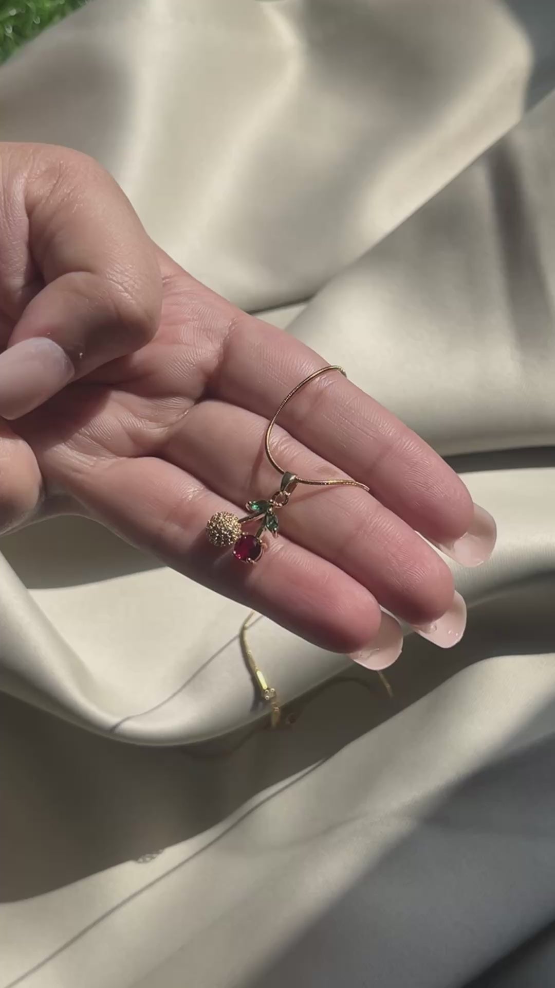 CherryDew Pendant highlights glossy red cherries with delicate green leaves. Cute, fresh, and full of playful charm. 🍒✨